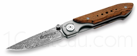 Design ligne premium: Claudio Riboni Les lames damas sont en RWL34 : les aciers ATS34 et 440A sont forgés ensemble à une température de 1200 degrés, les barres d'acier sont tordues puis pressées sous 30 Tonnes pour obtenir ce damas.